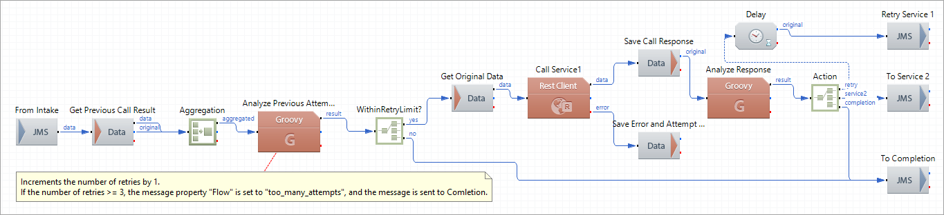 Later on, in the route, the WithinRetryLimit component checks the Flow property for a decision on the next steps in the message flow.