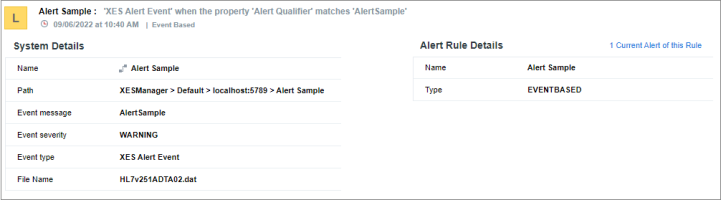 This is a low severity, event-based Alert with the Alert Sample profile set as the target system. The Alert Qualifier in the Condition section is the same as the Alert qualifier property for the Alert component in the sample profile. This Alert gets triggered once the Alert component in the profile passes the Alert qualifier property AlertSample to XESManager.