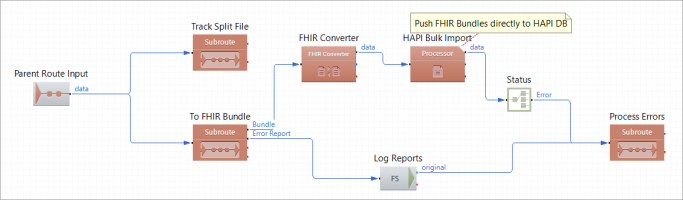 Process Split RouteThis subroute receives EDI split files – claims, converts the data to the FHIR format, and then sends the resulting FHIR bundle directly to a FHIR server's underlying database. Route Components Description