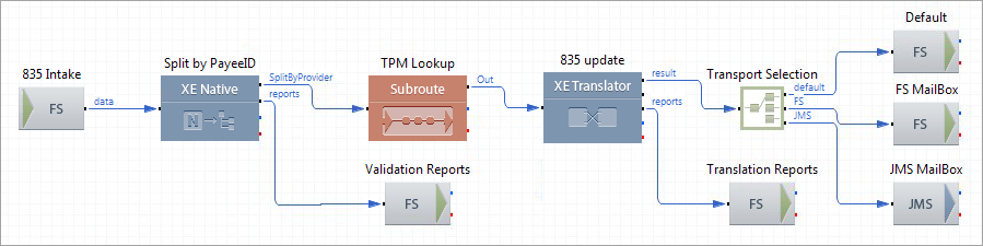 On this route, an incoming 835 Claim Payment transaction is split into individual Provider transactions and an emulated Transaction Management system extracts the required information on the Provider. Then, an 835 Claim Payment transaction is created with corresponding updated segments, and finally directed to the required destination. Route StructureRoute Components Description