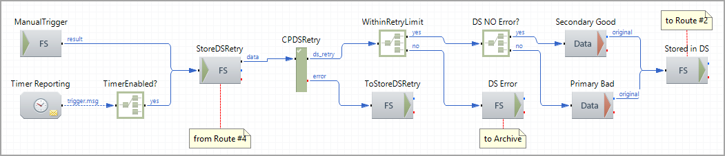 This route saves data to a reserve Data Storage. If the route is not able to save a message at the first attempt, XEServer makes 3 more attempts to store the message (the number of attempts is controlled by the XEServer environment property ${RetryCountNum}), and if this fails, XEServer stores the message in an archive for further investigation. If XEServer is able to store the message successfully, the route sends the message to 3 Validate Error Route.