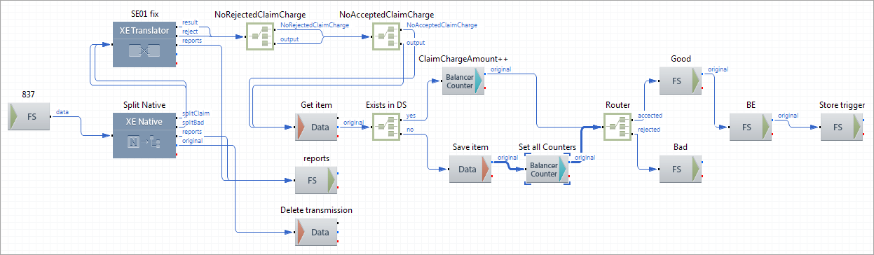 This route processes a batch of Interchanges. The route splits each interchange claims-wise and initializes the counter variables. For each claim in the Interchange, the route updates the counters to have a dollar amount of accepted and rejected claims that match the dollar amount in the claims in the whole Interchange. The route saves the original Interchange in Data Storage to allow the system to determine whether to create a new Balance Counters item, or to update the existing one. After the processing is complete, the route deletes the transmission data from Data Storage.