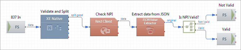 This profile handles the processing of NPI validation through an external validation service. The route NPI Data Processing picks up an incoming 837 Professional transaction, validates and splits the good data into separate files, one for each Provider. The corresponding route component extracts the NPI number from each file and passes the resulting data as a query parameter. The route sends a request to an external service to check whether the passed NPI number is registered with the NPPES NPI Registry. Based on the response, the route saves claims to the file system in either one of the folders Valid or Not Valid.