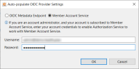 Provide your Smart Trading Cloud credentials (administrator) and then click OK. If the credentials are correct and the account has a Member Account Service subscription, XEConnect pulls OIDC settings from MAS and populates the service settings: