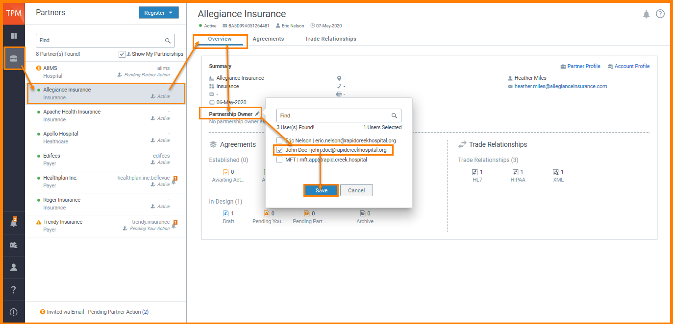Partner OwnershipIn Trading Partner Management, only the Administrators and the Partnership Owners can make changes to a partnership such as creating or modifying Trade Relationships and Agreements. For more information on the permissions available to different users, refer to the Role Based Access section. You become a partnership owner under the following conditions: