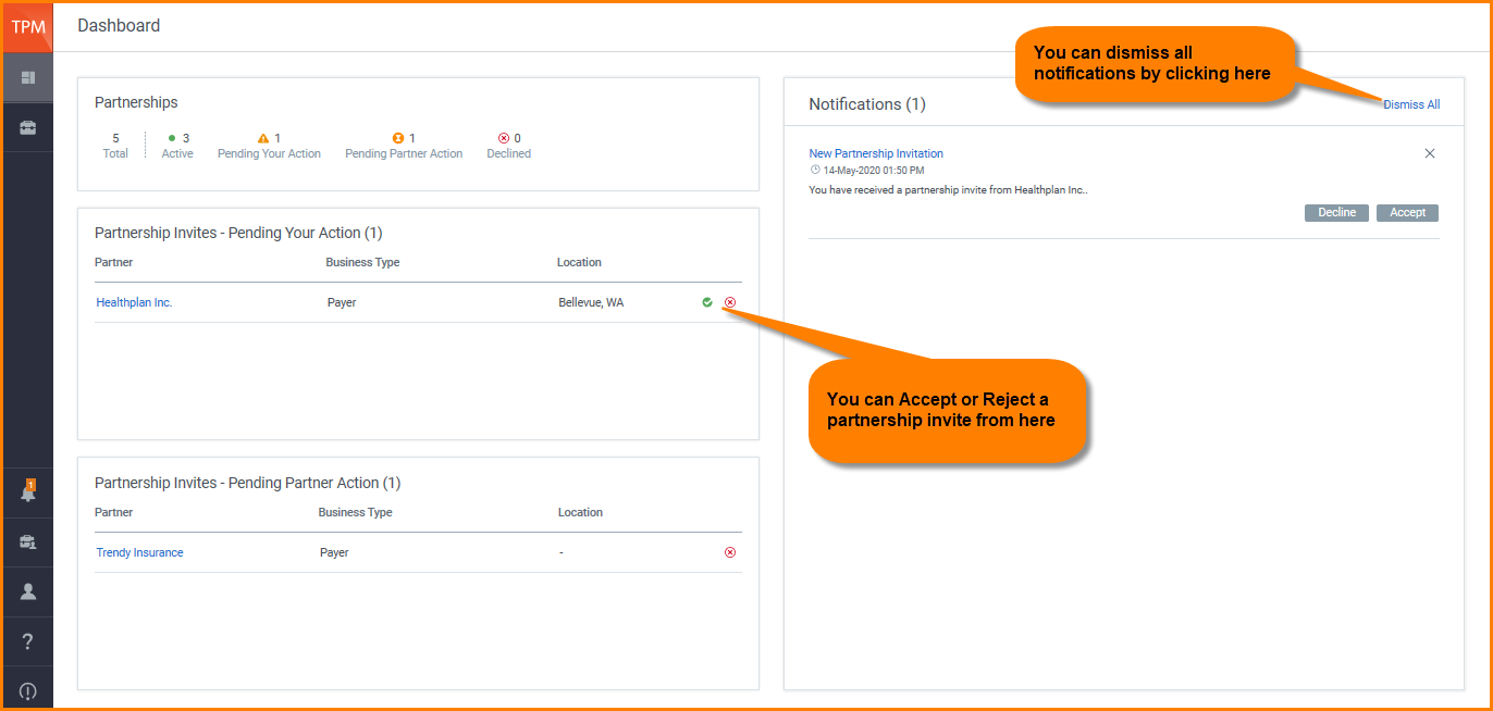 DashboardThe dashboard in Trading Partner Management displays a summary of all the important information related to your account. Note: Currently Dashboard is available to administrators only. The Dashboard has four different sections: Partnerships: Displays a summary of all of your partnerships. Partnership Invites - Pending Your Action: Displays the partnership invites that you have received. You can accept or reject the invites. Partnership Invites - Pending Partner Action: Displays the partnership invites that you have sent out. You can delete them if the invites were sent out by mistake or are not required anymore. Notifications: Displays all the notifications related to your account. You can act on notifications from here or dismiss all of them.