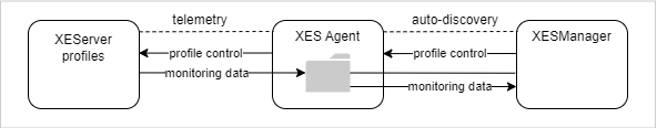Container ModeA container mode is a special XEServer operation mode that adopts XEServer features for use in a containerized environment. In this mode the behavior of some XEServer components changes to adjust to running in a container to support reliability, simplify deployment, and allow following the best practices. The container mode is activated by setting the environment property EDFX_CONTAINER_MODE. For detailed information on how this mode changes the behavior of separate components, see XEServer documentation. XES Agent Communication in Container ModeIn the container mode, XEServer profiles communicate with the XEServer Agent using the telemetry protocol. This data exchange mode allows data transmission (events, statistics, health statuses) between profiles and the agent in a containerized environment. The interaction between XEServer profiles and XESManager in the container mode looks as follows: