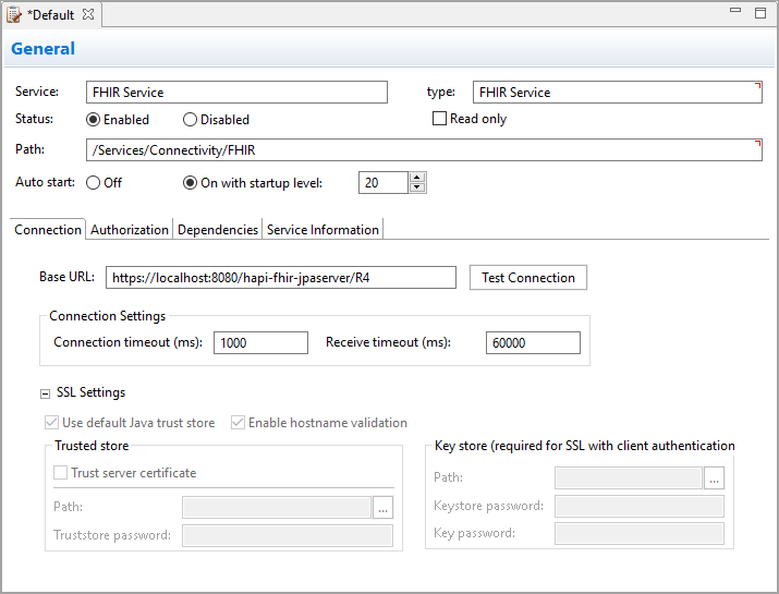 Connection TabOn this tab, you can specify connection parameters to connect to a target FHIR server. For more information, see FHIR connection parameters. Authorization TabOn this tab, you can specify how the target FHIR server should authorize the XEServer's connection. For more information, see FHIR authorization parameters. Dependencies TabOn this tab, you can view the route components associated with the current service. Click a component to view the component in the Route Editor. |